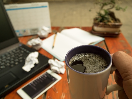 Man working on laptop and holding cup of black coffee for great ideas. Coffee with work and relax time. Freelance work, Laptop computer, phone and coffee.