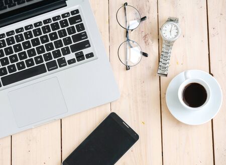 Office table with laptop computer, notebook, digital tablet, pen, smartphone, mouse, eyeglasses and coffee on white wood background. Desktop office mockup concept.
