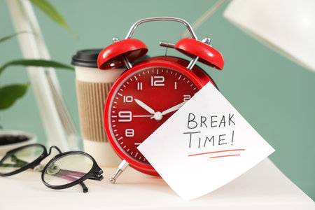 Paper with text BREAK TIME, alarm clock and coffee cup on table in office, closeup