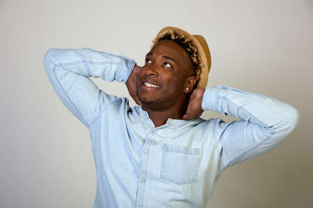Close-up portrait of a young black man in a hat, laughing, with his hands behind his head, on a white background