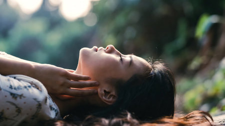 Close up portrait of beautiful young asian woman lying on the ground with eyes closed