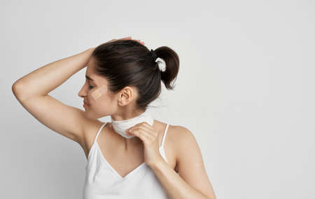 brunette with a bandaged neck holding her head health problems