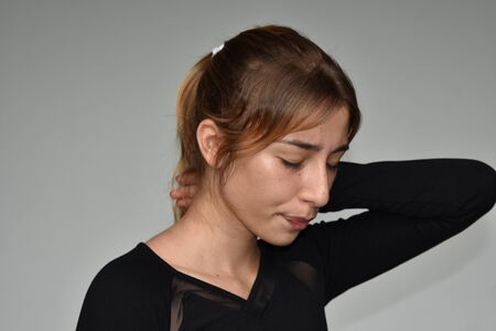girl teenager isolated on white background. The girl holds her neck with her hand, neck pain. Fatigue, tiredness. Horizontal photo