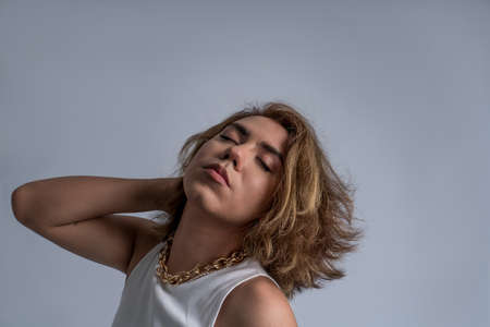 Portrait of accpetance angrogynous young with long hair and cool style with calm attitude in studio