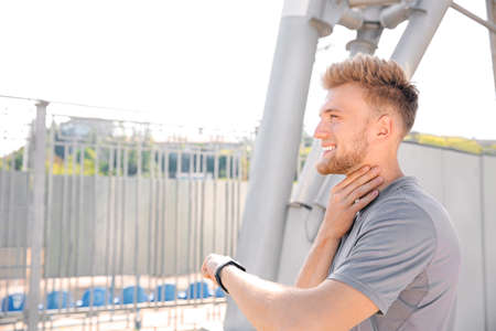 Sporty young man checking his pulse outdoors