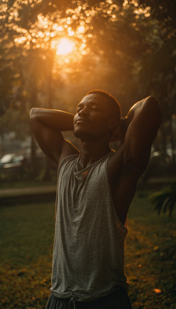 A confident man stretches outdoors in a park, basking in the morning sun filtering through the trees. The scene captures a relaxed lifestyle and the tranquility of nature.