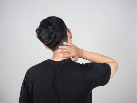 Young Asian man suffering from neck pain, isolated on white background.