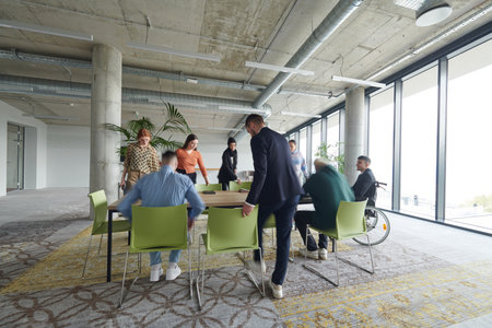 Business Team Led by Director in a Wheelchair Preparing for a Meeting in a Modern Office.