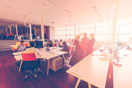 Motion blur captures the dynamic atmosphere in a bustling co-working space filled with professionals and entrepreneurs