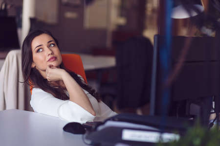 Portrait of successful female software developer with a curly hairstyle at modern busy startup office