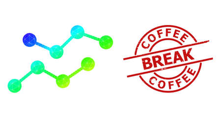 Coffee Break dirty seal, and lowpoly spectral colored charts icon with gradient. Red stamp seal has Coffee Break caption inside circle and lines form.