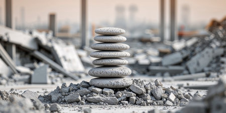 AI Generated. Stacked Circular Stones on a Construction Site with Crumbled Concrete and Dirt Surrounding Them