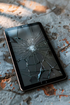 Close-Up of a Shattered Tablet Screen on Textured Surface