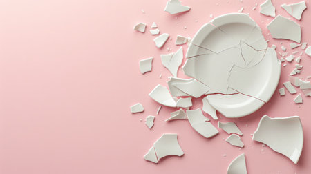 Pieces of broken ceramic plate on pink background, flat lay. Space for text