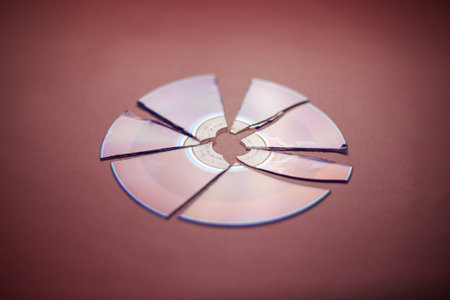Broken compact disc divided into parts close-up on a red-burgundy background, complete loss of data