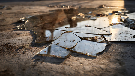 Shattered glass shards scatter across a dark wooden surface, reflecting warm sunlight. The delicate fragments create a kaleidoscope of light and shadow in the late afternoon.