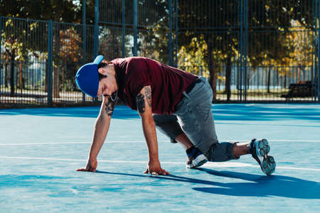 Unrecognized cool young man doing break dance moves in the street and having fun.