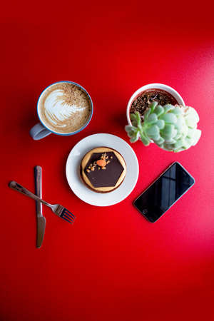 An overhead shot of a phone plant coffee and a small cake on the red background