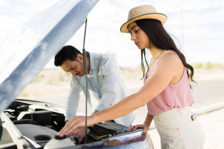 Upset young woman and man checking the engine after the car broke down during a road trip