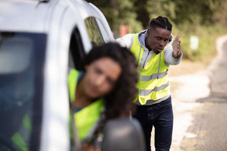 Young couple argue while trying to fix their broken down car