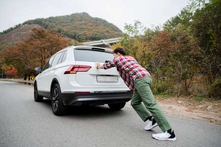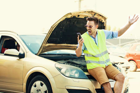 Car breakdown. Young man is trying to solve the problem.