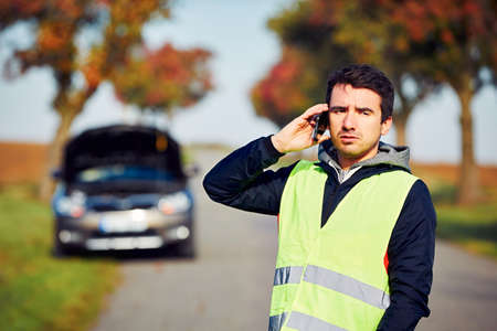 A man by the side of the road is standing in front of a broken car, waiting for the insurance company. Real people emotions, face expression. Engine problem.