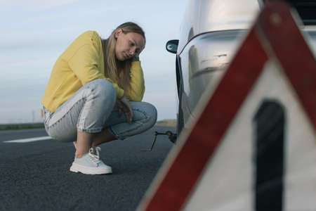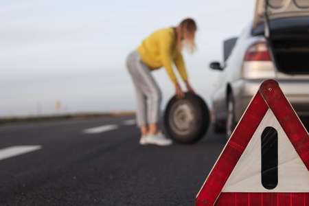 a girl in casual clothes stands near the rear wheel of the car and rolls the spare wheel to change. Car breakdown, the wheel has been pierced. Close-up and focus on the emergency stop sign,