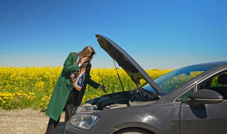 a girl with blond hair of European appearance in casual clothes, stands with an open hood of a car and looks at what has broken. A car breakdown on the road. there is a place for an inscription