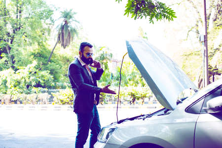 worried Indian Businessman with vehicle/car breakdown, talking on phone