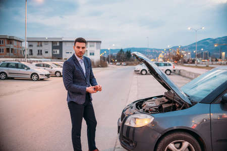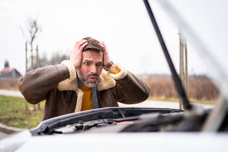 Serious man front of car breakdown and open bonnet on roadside. Car broken concept.