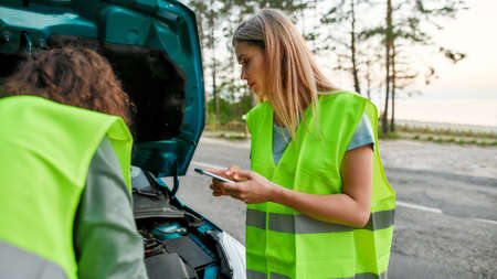 Couple wearing reflective vest having troubles with their auto, Young woman going to call car service or assistance while man looking under the hood of broken car