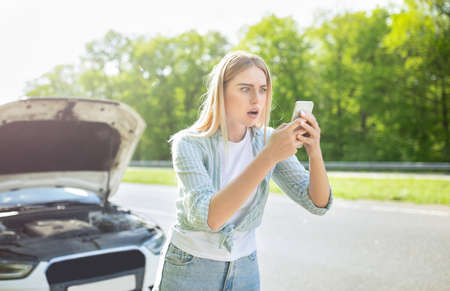 Terrified blonde woman looking for signal after car breakdown, holding smartphone, cannot find mobile network