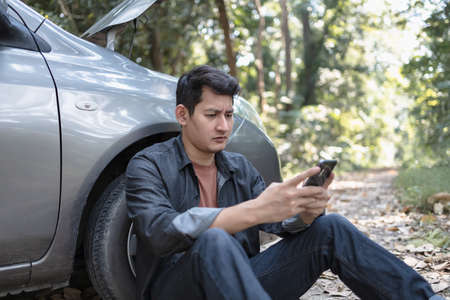 Man use a cellphone call garage in front of the open hood of a broken car on the road in the forest. Car breakdown concept.