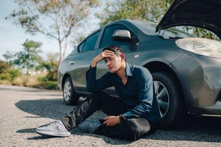 Stressed man sitting after a car breakdown with popped up hood at the side of the road, waiting for towing service for help car accident on the street.