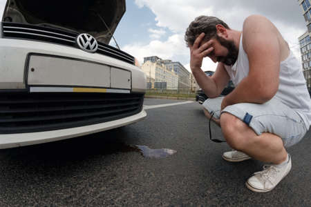 Moscow, Russia - June 27, 2016: young man having trouble with car radiator broke