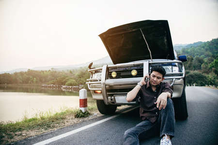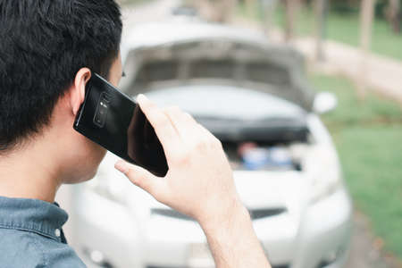 Asian man using mobile phone calling for assistance after a car breakdown on street. Concept of vehicle engine problem or accident and emergency help from Professional mechanic