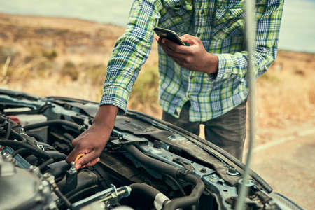 Maybe its the oil. Cropped shot of a young man checking his engine oil after breaking down.
