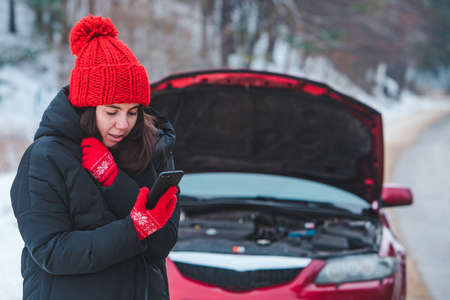 woman calling for help with broken down car at winter highway