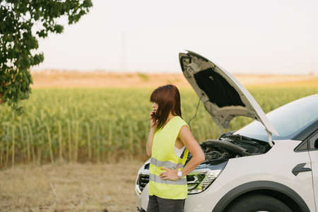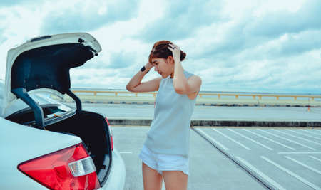 Young stressed woman having trouble with her car breakdown on the road and she waiting someone can help her. Conceptual of car accident on the road.
