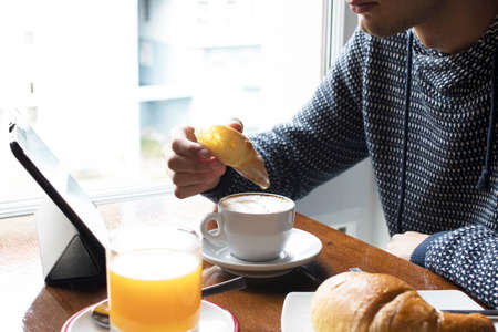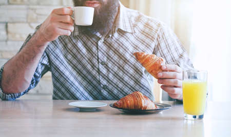 bearded man having breakfast with cup of morning coffee and croissants