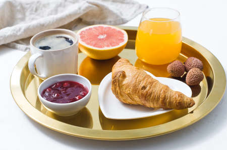 French Breakfast on a Golden tray, coffee, jam, croissant, orange juice, grapefruit, lychee. Top view, white background