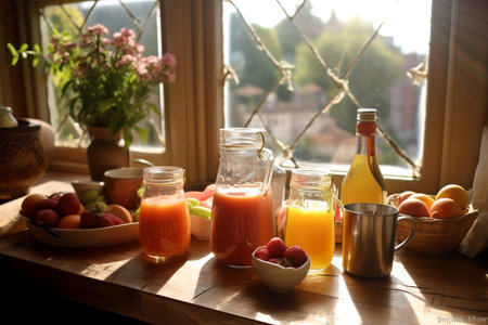 A vibrant breakfast scene featuring fresh juices, eggs, toast, and a variety of fruits and vegetables, showcasing a healthy and colorful start to the day.