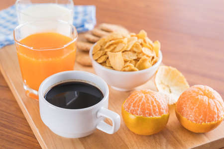 Breakfast served food with beverage coffee, orange juice on table in the morning at home, Fresh and bright continental breakfast healthy