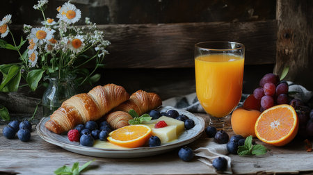 A beautifully arranged breakfast spread with a glass of orange juice, croissants, and fresh fruit, set on a rustic wooden table.