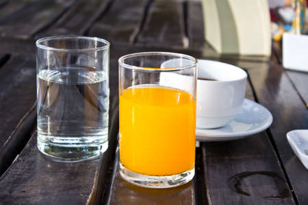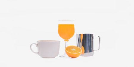 Delicious orange juice with cup of coffee and orange slice