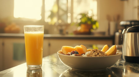 A refreshing breakfast scene: a glass of orange juice next to a bowl of granola, yogurt, and fresh fruit on a bright kitchen counter