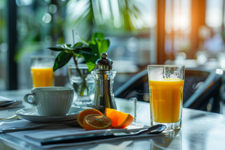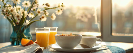 A breakfast table with a bowl of cereal, a glass of orange juice, and a cup of coffee, set against a bright morning backdrop.