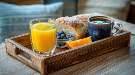 A wooden tray holds a refreshing glass of orange juice, a cup of coffee, fresh pastries, and fruit. The setting is warm, inviting, and perfect for a relaxing breakfast moment.