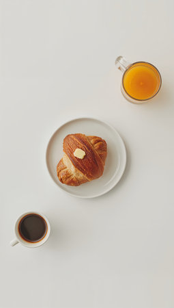 A bright breakfast table featuring croissants, orange juice, and coffee in a sunny setting