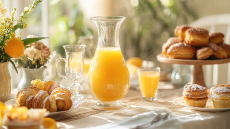 A cheerful brunch table setting with a carafe of orange juice, beautiful glassware, and delicious pastries, creating a warm and inviting atmosphere.